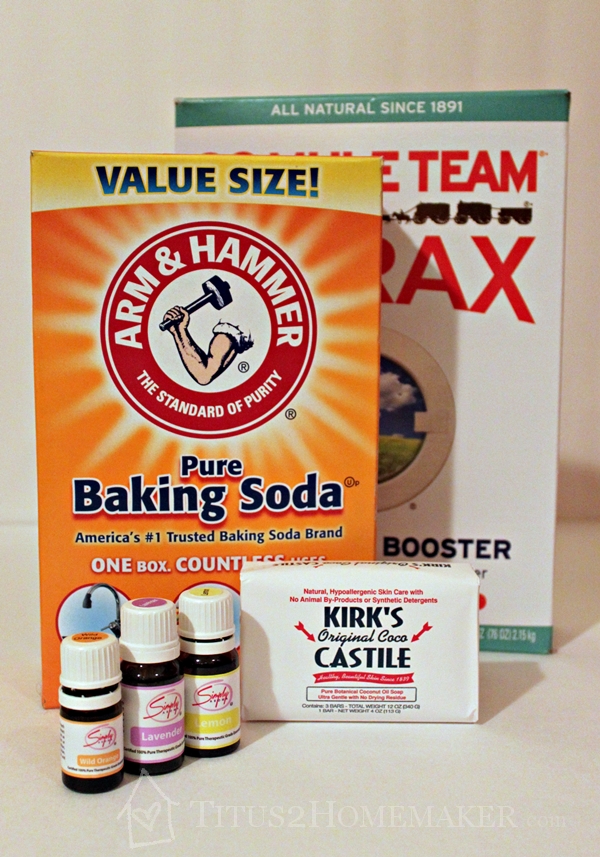 This recipe calls for soap, borax, baking soda, and (optionally) essential oil.