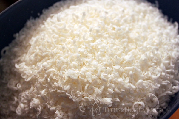 You can just measure out soap flakes, but those are pretty well impossible to find here in the U.S. If you’re in Europe, you might be able to buy them and save yourself a step. Most of us have to start by making soap flakes. I prefer to use castile soap — I’ve used Dr. Bronner’s and I’ve used Kirk’s (from Vitacost). It’s been a while, but if I recall correctly, the Dr. Bronner’s bars are a little smaller, so make sure to check if you’re using those.