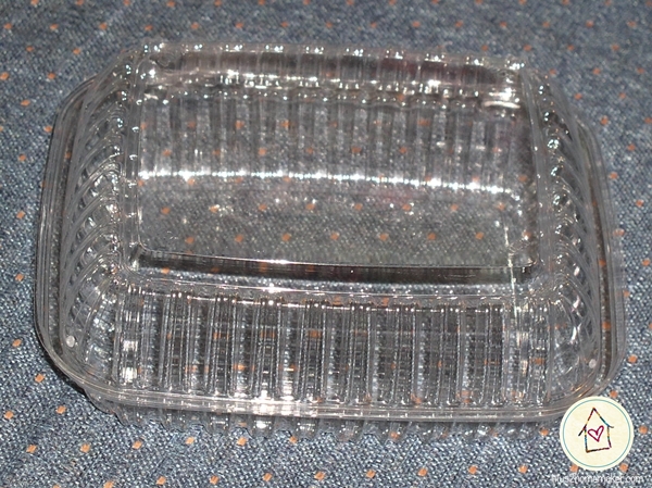 When I had satisfied myself that this actually works, I went ahead and made plans for obtaining something with bigger, flatter pieces of plastic, namely, deli containers. I purchased these from our local health food store, which sells sandwiches. I am told that you can buy whole packages from Sam’s Club, and that you can usually pick up one or two from salad bars, etc. (Please ask first; don’t just take them!) The best option, of course, would be to upcycle containers you’ve already gotten food in, rather than getting new ones. I bought a dozen from the health food store for 20 cents (total). These provide larger pieces of plastic, as the entire top and bottom surfaces can be cut free.