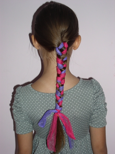 The first thing you do is complete whatever hairstyle you want, without the ribbons. Then, following the instructions, you use the tool to “sew” the ribbon through the hair. This, I can do! The set comes with a handful of strips of a fine tulle, but I think you could use the tool with any other ribbon you like. My girls were thrilled with their hair, and my husband was impressed. The girls got lots of comments on their hair, too.