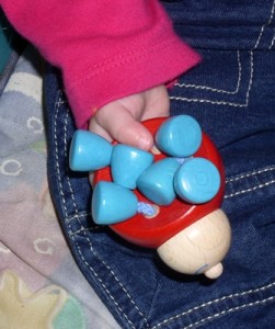 Although it appears in this photo that the beetle has four legs, he does actually have six. (UPDATE: See my photo below.) They’re connected by little rope-like pieces, so the legs rattle when the bug is shaken. Although Livia’s hands are pretty tiny and she has a hard time gripping this well just yet, she loves this! (She is officially a tad young for it yet. The recommended age is 10 months and up; she’s only 8 months – and tiny, at that.) The natural wooden clinking sounds are not annoying, either, like a lot of the modern plastic gizmos.