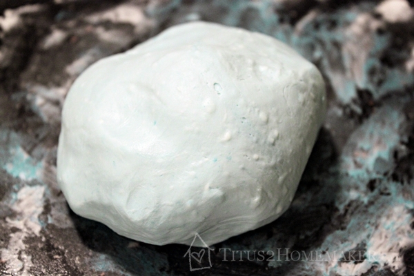 Now, I wanted some that was turquoise, but I wanted to leave most of it white. So I started with just the ingredients I mentioned. But once I got to this stage, I split it in two, added some turquoise to the second lump, and kneaded it in. Note that this is really messy and if my surface had not been black, I might have thought twice about this. I don’t much have to worry about whether this stains, though.