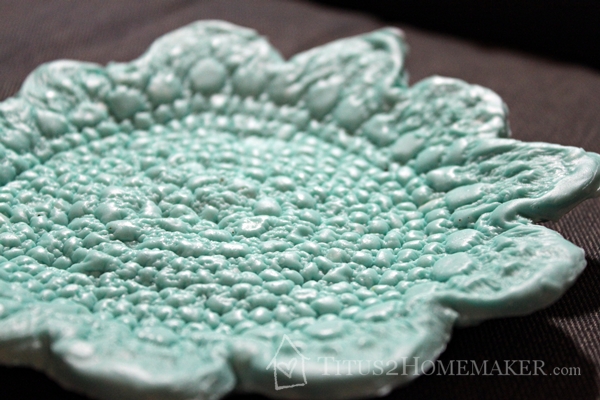 Then I tried to cut around it. It wasn’t nearly as neat as I would have liked. The “clay” kept wanting to stretch and pull. But I got that part done. I peeled the doily off — that was not a problem.