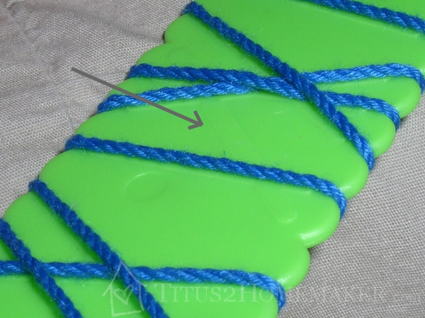 When he’s finished, he locks the string in place through the notch at the bottom, then flips it over to check his answers. The back of the Wrap-Up has raised ridges on it that form lines where the strings should cross if he’s answered everything correctly. So if he got them all right, the ridges and strings should all match.
