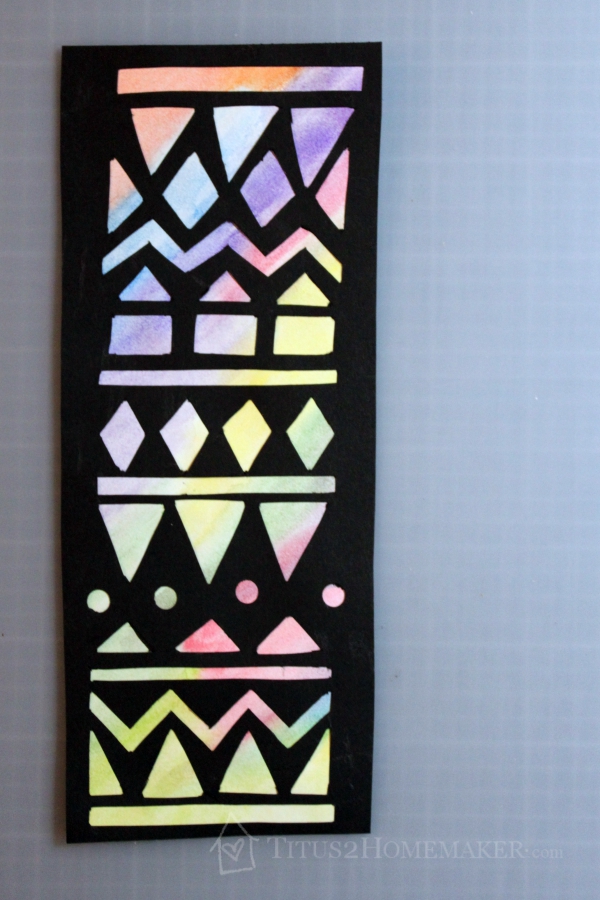 Then I trimmed the painted paper to size and glued it to the back of the black piece. (I used glue stick, because someone lost the glue I had with my art kit. It made smeary places; I wouldn’t recommend it. Or at least be more careful than I was.)