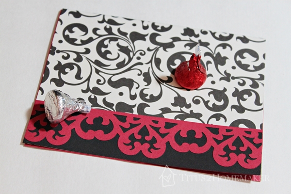 First, I had to make the card. Using a black-and-white print paper from Family Christian Store, plus the punch and a little bit of solid red & black cardstock I had on hand, I made a simple card. Seriously, this was not at all complicated. I used the edge punch to punch a strip of red cardstock, glued it to a strip of black cardstock so it would show up better, and glued that to a card folded from the black & white paper.