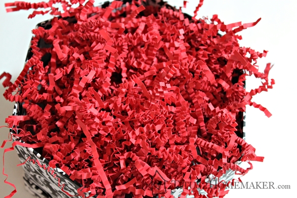 Then I covered the tissue paper with a layer of red paper shred. (I already had that on hand, too. When I get packages with this stuff in it, I save it in zipper-seal bags, by color.)