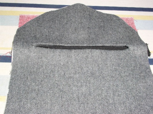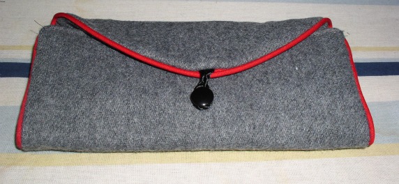 The bulk of the wallet is made from a grey wool. (That’s the part that’s too thick – where pocket parts overlap, the seams were terrible to sew.) It has red piping, and the pockets are lined with a red print.