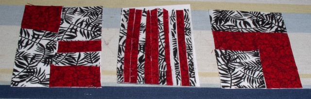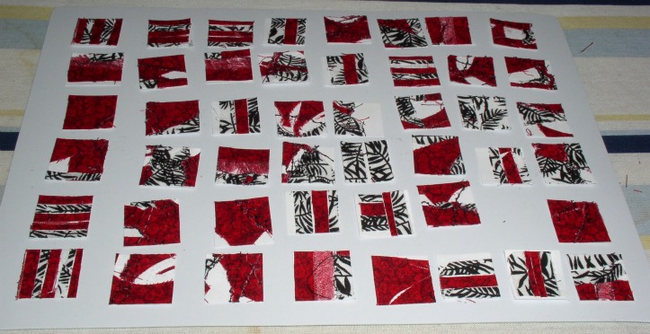 For these inchies (and the ATC’s below), I ironed the scraps to fusible web, then ironed that to a piece of cardstock for support. Then I just cut them to the appropriate sizes. I just put the inchies in a baggie and sent them to my swap partner to use in her own projects, but if I’d done something with them myself I would probably have used them on cards. These prints together made some really neat, graphic-looking inchies, I think.