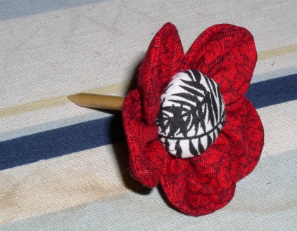 I think this pincushion is the coolest idea ever! It is designed to sit atop a thread spool, as shown in the second picture.