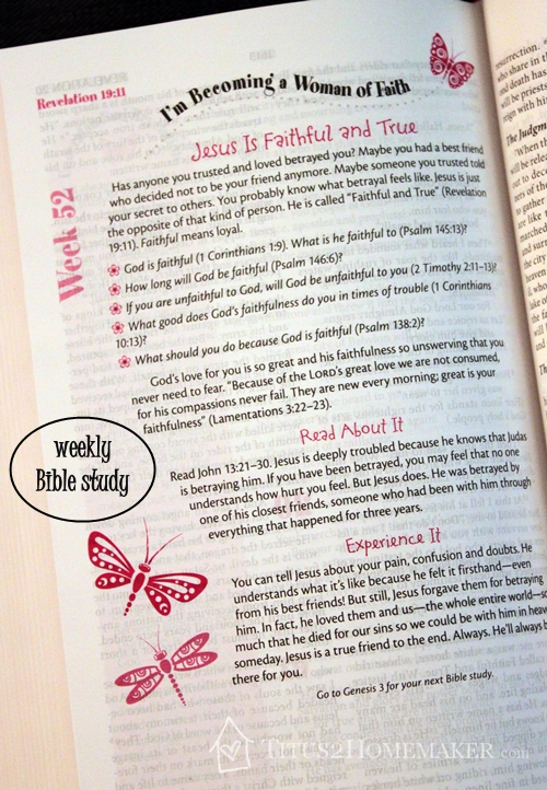 Scattered throughout the text are memory verses. Essentially, these are pull-quotes. Ariel said these are “a little helpful.” Sometimes they chose the verses she’d choose to pull out; other times their choices of the most notable verse in a passage was different. Of course, this is to be expected. Even from one year to the next, the same person might choose a different verse. I think they offer a handy starting point.