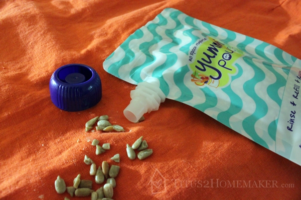 I had this brilliant idea to use them for small, dry foods as you see in the photo at the top of this post. We always get sunflower kernels in those little pouches at the gas station when we’re going on a trip, and they’re great, but once they’re open, they’re open, and you spill them everywhere. So I thought this would be a great solution.